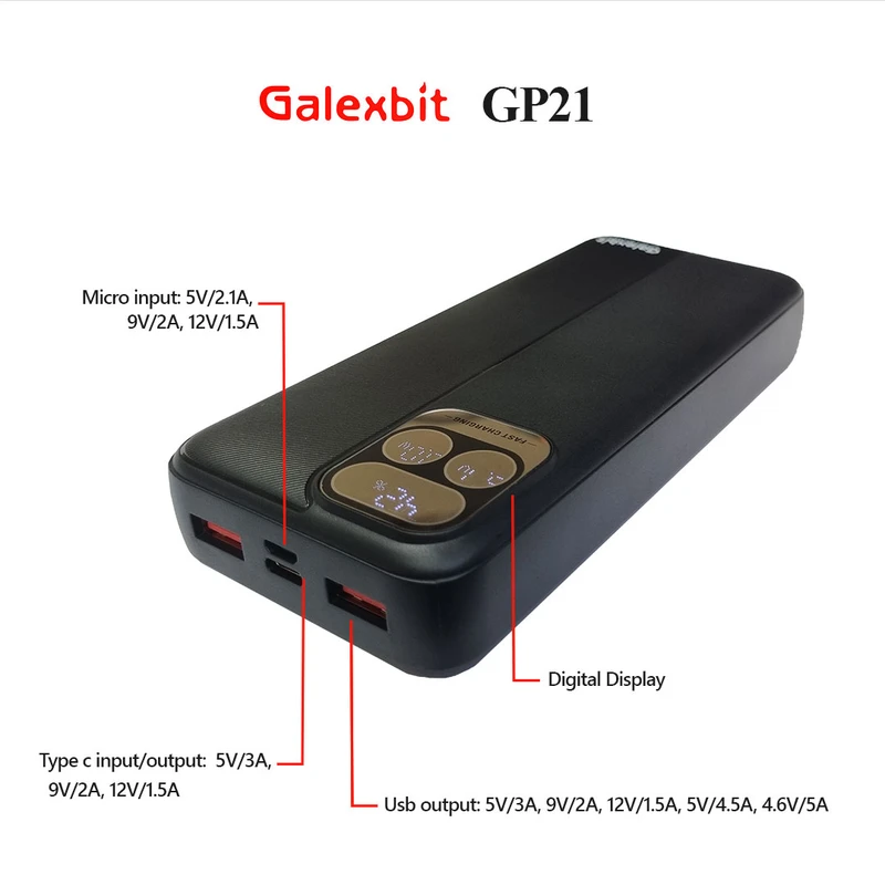 شارژر همراه (پاوربانک) گلکسبیت مدل GP21 PD که با گارانتی شرکت تلاش عرضه میگردد با توجه به ظرفیت بالایی که دارد و همچنین به دلیل پشتیبانی از انواع پروتکل های شارژ سریع و هوشمند بهترین همراه شما در سفر و کمپ های خارج از شهر می باشد و با استفاده از این شارژ هوشمند به راحتی میتوانید به طور همزمان دو دستگاه مختلف را با ولتاژ ورودی مناسب هر دستگاه شارژ کنید. این پاوربانک دارای یک درگاه (پورت) TYPE-C و دو درگاه (پورت) USB می باشد و یک درگاه (پورت) micro در طراحی ان از صفحه نمایش LED استفاده شده که نمایشگر درصد شارژ پاورباک شماست. این سری از پاوربانک های Galexbit دارای فناوری PD هستند و از استاندارد خاصی استفاده می کنند ، این استاندارد ها معمولا در دفترچه راهنمای پاوربانک ذکر شده که شامل این موارد می شود: 1 - ولتاژ بیش از حد نرمال (Over Voltage Protection) یعنی بتواند در برابر شدت جریان زیاد مقاومت کند. 2 - بیش از حد شارژ شدن (Over Charge Protection) یعنی بتواند انتقال نیرو را زمانی که شارژ پر می شود قطع کند. 3 - شدت جریان بیش از حد (Over Current Protections) یعنی زمانی که برق قطع و وصل می شود یا ولتاژ بالا می رود آن را خنثی کند تا آسیب به باتری یا پاوربانک نرسد. 4 - گرما (Over Heat Protections) یعنی بتواند در برابر حرارت بالا و بالا رفتن دما در اثر شدت جریان زیاد مقاومت کند. 5 - اتصال کوتاه (Short-Circuit) یعنی در برابر نوسان مقاوم باشد.